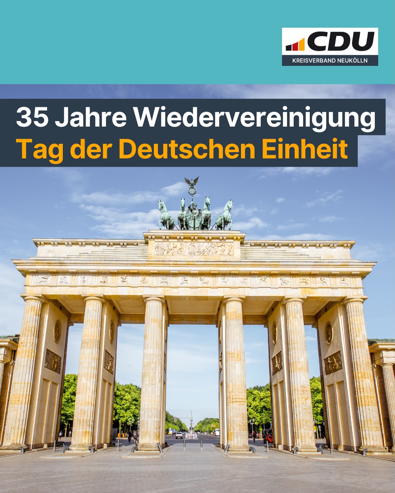 mehr🇩🇪 Heute feiern wir 35 Jahre Deutsche Einheit 🎉 Am 3. Oktober 1990 wurde die deutsche Wiedervereinigung 🇩🇪 Wirklichkeit! Ein historischer Moment, der Demokratie, Freiheit 🕊️ und Zusammenhalt 🤝 in unserem Land neu begründet hat. Auch 35 Jahre nach der Wiedervereinigung ist unser Zusammenhalt 🤝 keine Selbstverständlichkeit. Die Menschen, die damals für Freiheit 🕊️ und Demokratie auf die Straße ? gingen, haben uns ein großes Erbe hinterlassen. Dieses Erbe verpflichtet uns: unsere Werte zu verteidigen, wenn sie angegriffen werden 🛡️ und Spaltung sowie Hass entschieden entgegenzutreten. Die Deutsche Einheit 🇩🇪 ist mehr als ein historisches Datum. Sie ist ein Auftrag an uns, für ein starkes, freies und demokratisches Deutschland 🇩🇪 einzustehen. #cdu #cduneukölln #neukölln #dasbestefürneukölln #deutschland #tagderdeutscheneinheit