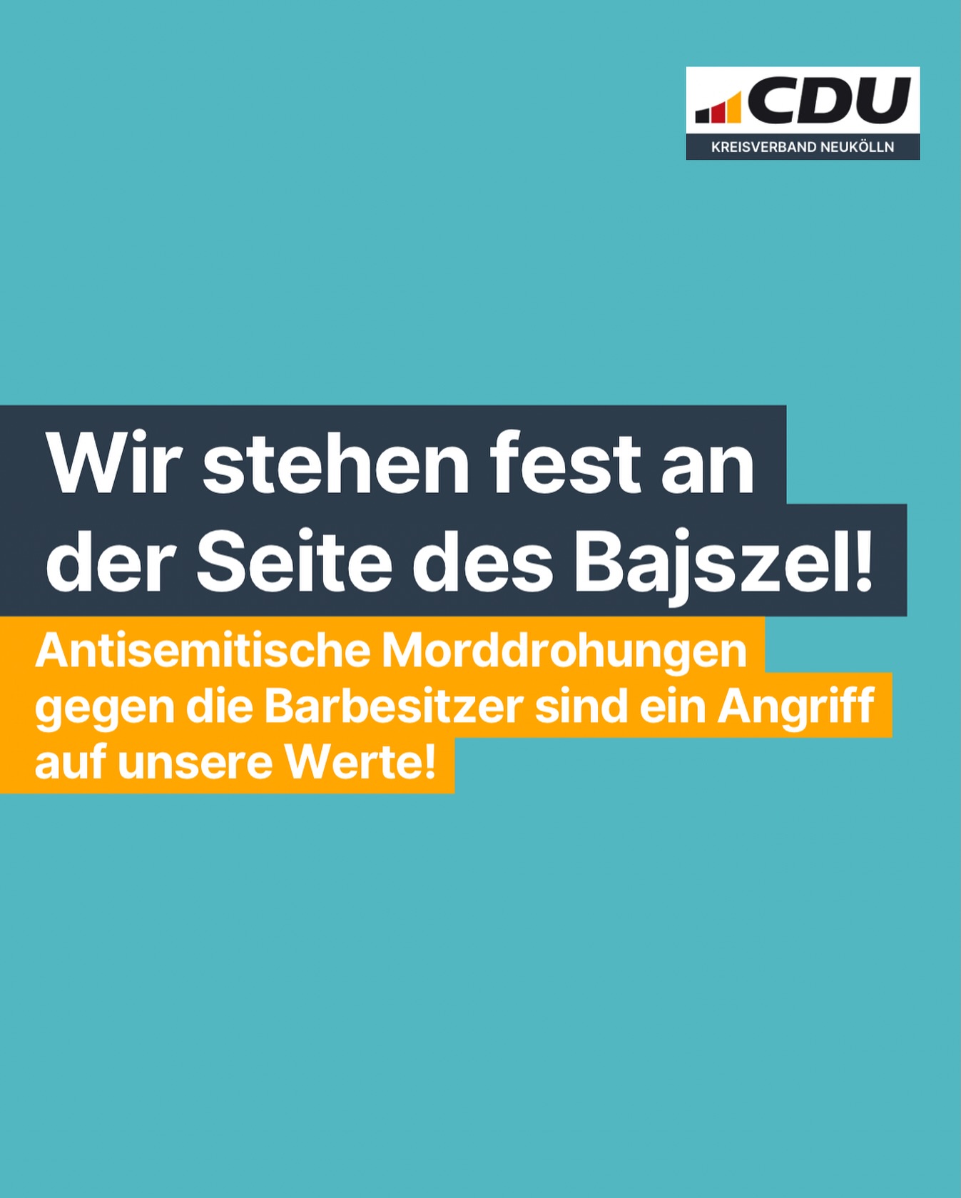 mehrMorddrohungen gegen Bajszel-Betreiber ? Wir stehen an ihrer Seite! Die Betreiber der Bar Bajszel 🍻 in Neukölln wurden mit antisemitischen Morddrohungen bedroht. Flugblätter mit dem Hamas-Dreieck wurden in der Nähe der Bar 🍻 verteilt. Diese widerwärtige Form des Hasses 😡 ist ein Angriff auf unser friedliches Zusammenleben ☮️ und auf die Werte, für die unser Land steht. 🙅♀️🙅♂️ Als CDU Neukölln verurteilen wir diese Taten aufs Schärfste. Antisemitismus, egal von wem und in welcher Form, darf niemals hingenommen werden! Wir stehen fest an der Seite 🤝 der Bar-Betreiber des Bajszel 🍻 und fordern eine konsequente Aufklärung 🔎 durch die Sicherheitsbehörden. Neukölln muss ein sicherer Ort für alle bleiben! #cdu #cduneukölln #neukölln #dasbestefürneukölln